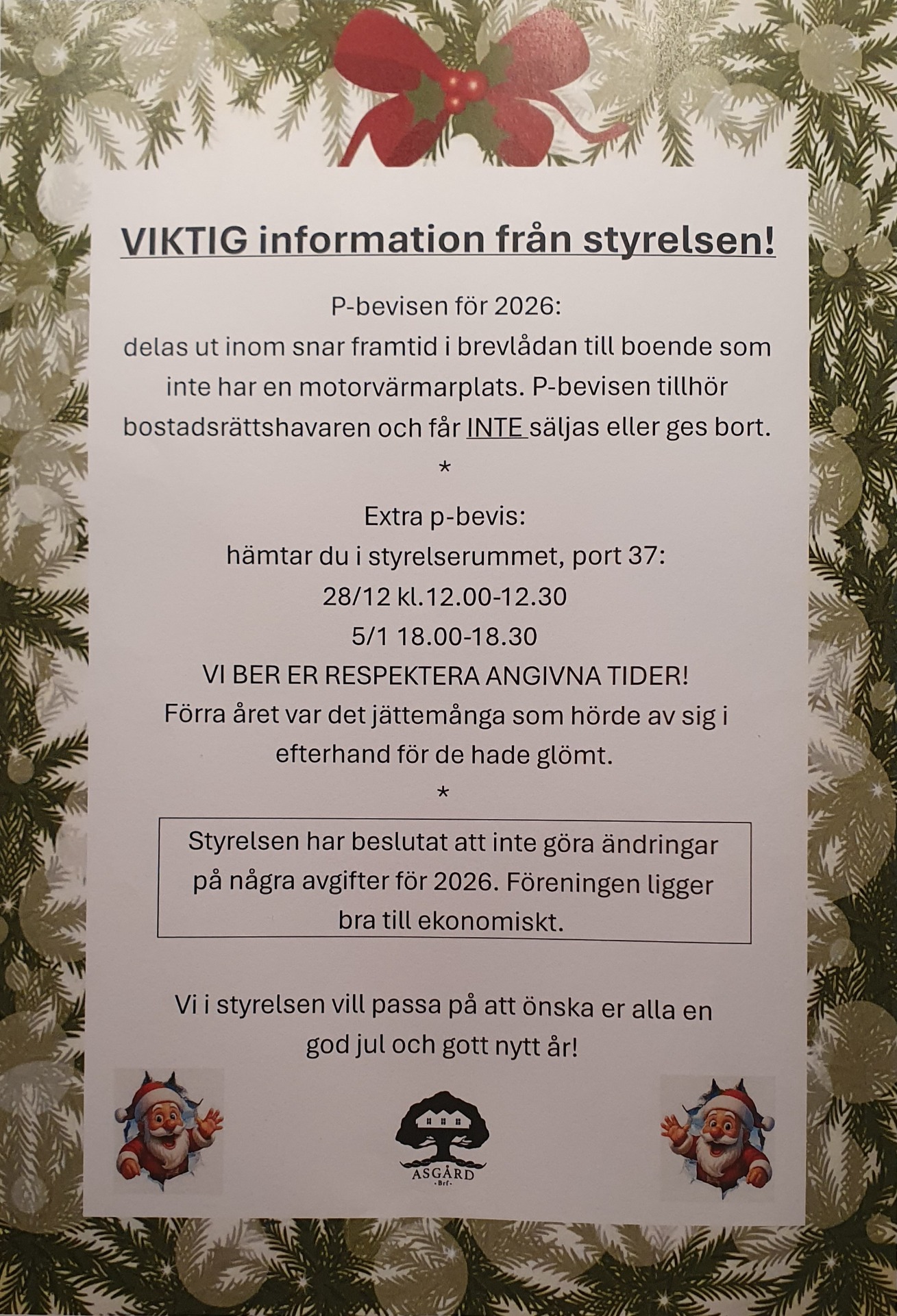 P-bevislapparna delas ut av Hjt under v 1 i brevlådorna till dem som inte har elstolpe. 2021-lapparna gäller tom 31/1. Extra p-lappar kommer man få hämta i styrelserummet framöver. Styrelsen meddelar i trapphuset när.